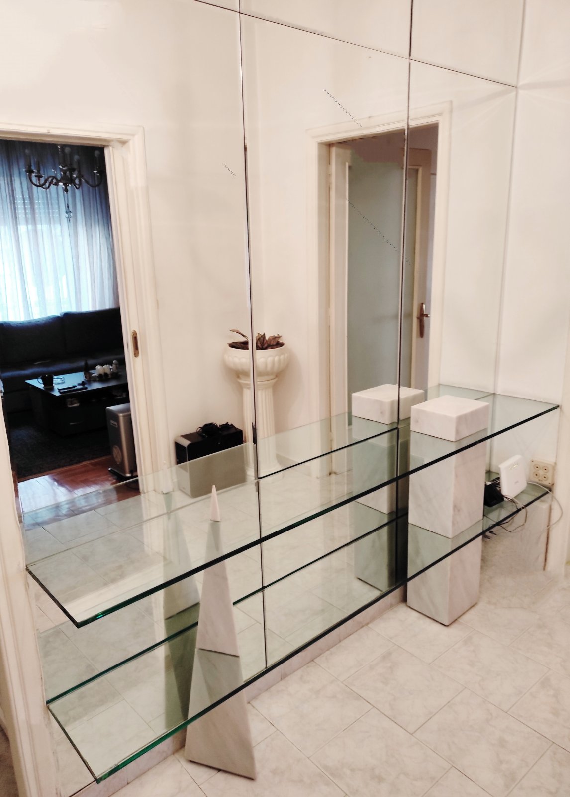 Πλήρης επένδυση καθρέπτη σε όλη την πλευρά για να δώσει διαφορετική ομορφιά στο χώρο καθώς και αίσθηση περισσότερου χώρου. Πάνω τους έχουν προσαρμοστεί ράφια στο μήκος του τοίχου, με κατάλληλο πάχος για αντοχή βάρους και τροχισμένα στις άκρες για ασφάλεια