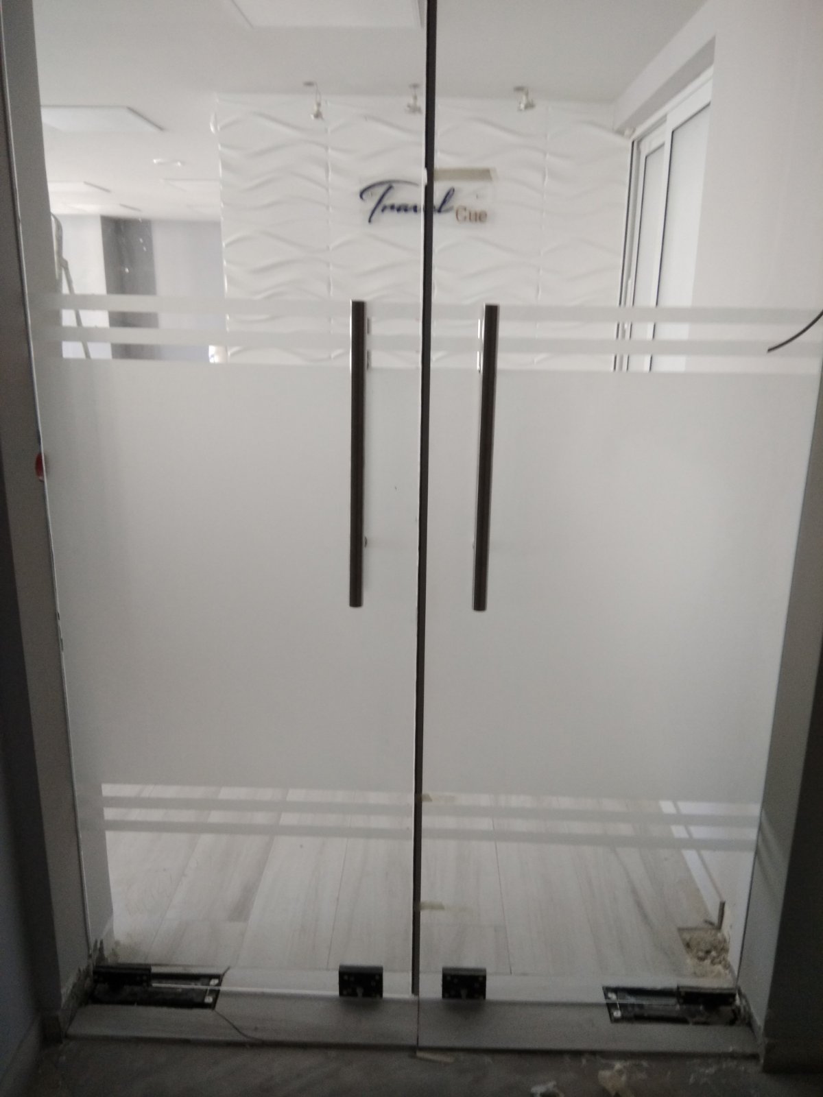 Πόρτες ασφαλείας από γυαλί με διακριτικό σχέδιο (matte) επιλεγμένο από τον πελάτη μας.